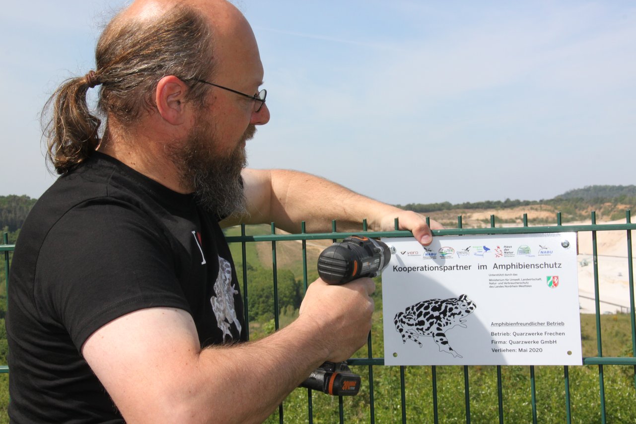 Um die bei der Rohstoffgewinnung entstehenden Ersatzlebensräume gezielt zu sichern und zu entwickeln, haben der NABU NRW, sieben rheinische Biologische Stationen und der Verband der Bau- und Rohstoffindustrie (vero) gemeinsam die Broschüre „Maßnahmen zur Unterstützung der Abgrabungsamphibien in der Rohstoffgewinnung NRWs“ in zweiter Auflage aktualisiert und veröffentlicht. Die Broschüre stellt konkrete, freiwillige Maßnahmen vor, mit denen Unternehmen ihre Betriebsflächen amphibienfreundlich z. B. für die Kreuz- oder Wechselkröte gestalten können, ohne den laufenden Betrieb grundsätzlich zu beeinträchtigen. Der Leitfaden richtet sich an Unternehmen, Behörden und Fachplanende. Er zeigt anhand praxisnaher Beispiele, wie Artenschutz in der aktiven Rohstoffgewinnung funktionieren kann. Flankierend zu den praktischen Maßnahmen verleihen vero, NABU und die Biostationen nach einigen Jahren konstruktiver Zusammenarbeit sowie erfolgreicher Stützung und Förderung der Amphibienbestände die Plakette „Amphibienfreundlicher Betrieb“.